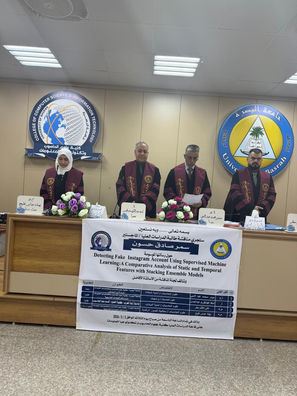 التي قدمتها الطالبة سمر صادق حسون كيفية تصميم نموذج يعتمد على تقنيات التعلم الآلي الخاضع للإشراف للكشف عن الحسابات الوهمية في إنستغرام، مع إجراء تحليل مقارن بين الخصائص الثابتة والزمنية وتطبيق أسلوب التجميع التكديسي.